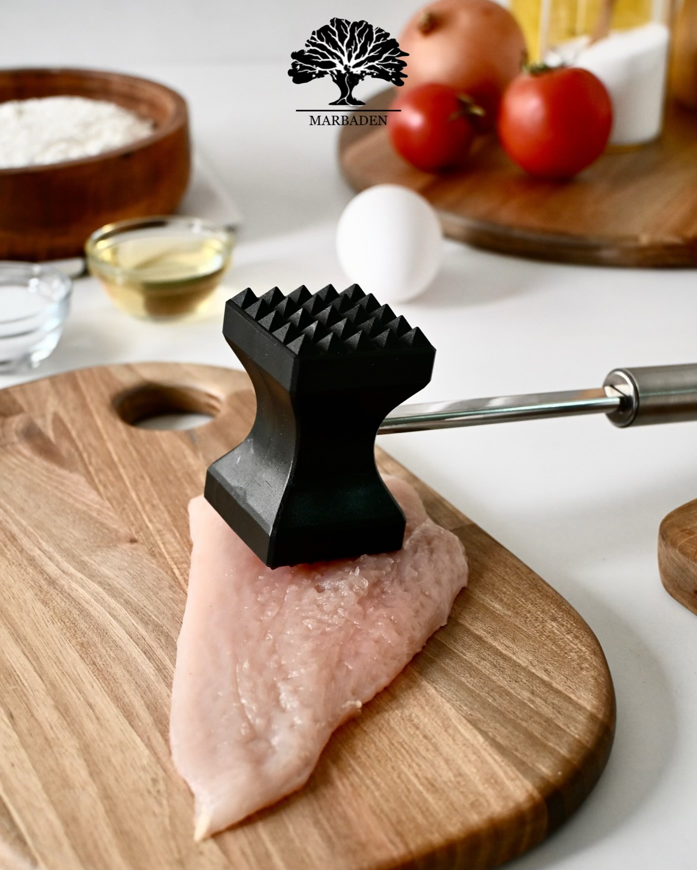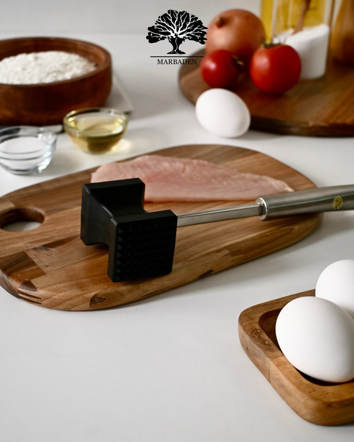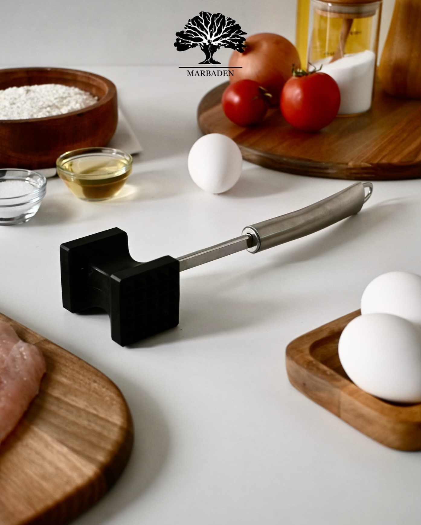ایدهآل برای نرم کردن گوشت گوسفند، گوساله، مرغ، ماهی یا حتی سبزیجات سفت قبل از پخت. طرف دندانهدار فیبرها رو میشکنه و گوشت رو ترد و لطیف میکنه (بدون اینکه پاره بشه)، طرف صاف برای پهن کردن و شکلدهی عالیه (مثل شنیتسل یا کتلت). همچنین برای خرد کردن سیر، مغزها یا شکستن پوسته سخت هم کاربرد داره. نسبت به چاقو یا ابزارهای ساده خیلی موثرتر و سریعتر کار میکنه.