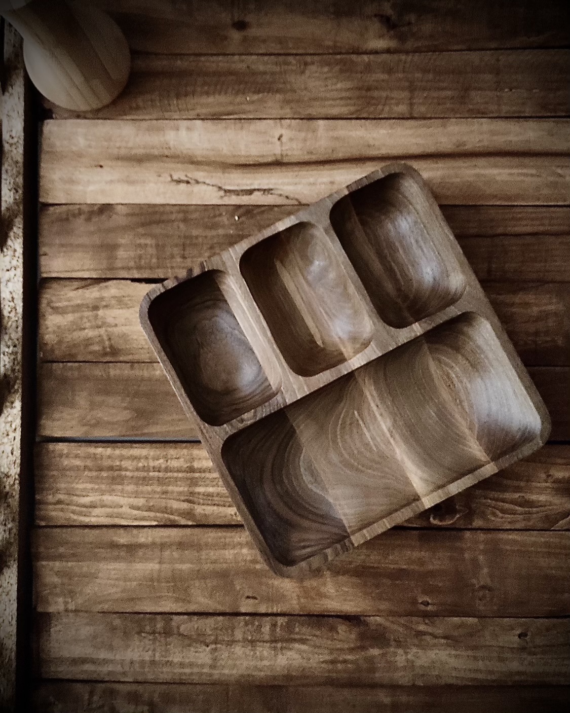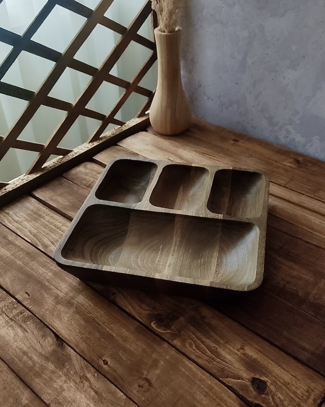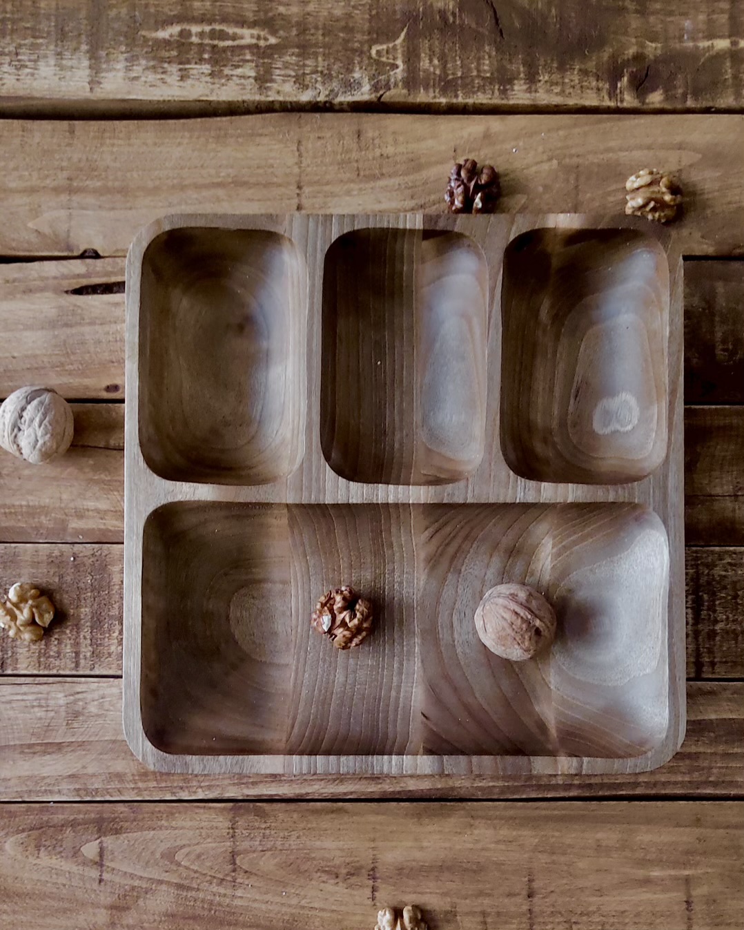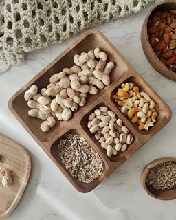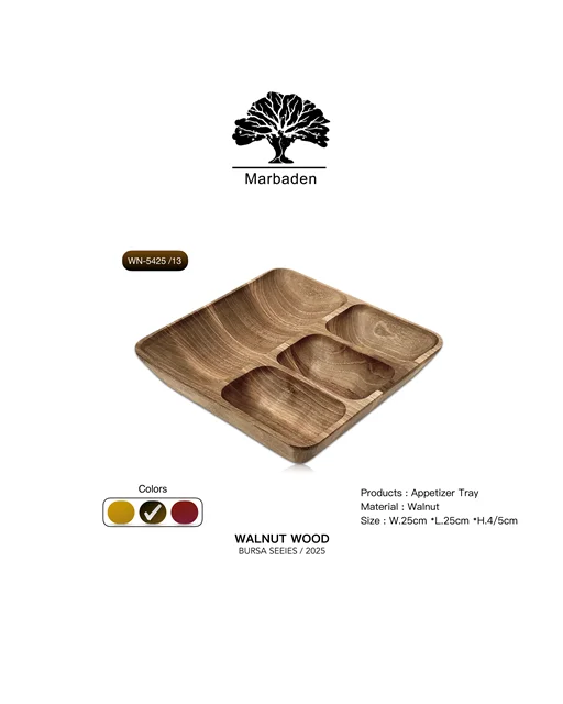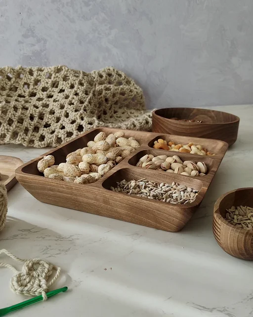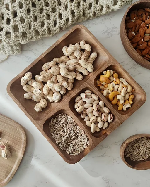 اگر دنبال یه ظرف متفاوت و زیبا برای پذیرایی هستی، این اردوخوری مربعی از چوب طبیعی گردو دقیقاً همون چیزیه که لازمه. طراحی خاص با چهار بخش—یک خونه بزرگ برای خوراکیهای حجیمتر و سه بخش هماندازه برای تنقلات کوچیکتر—هم کاربردیه، هم چشمنواز.