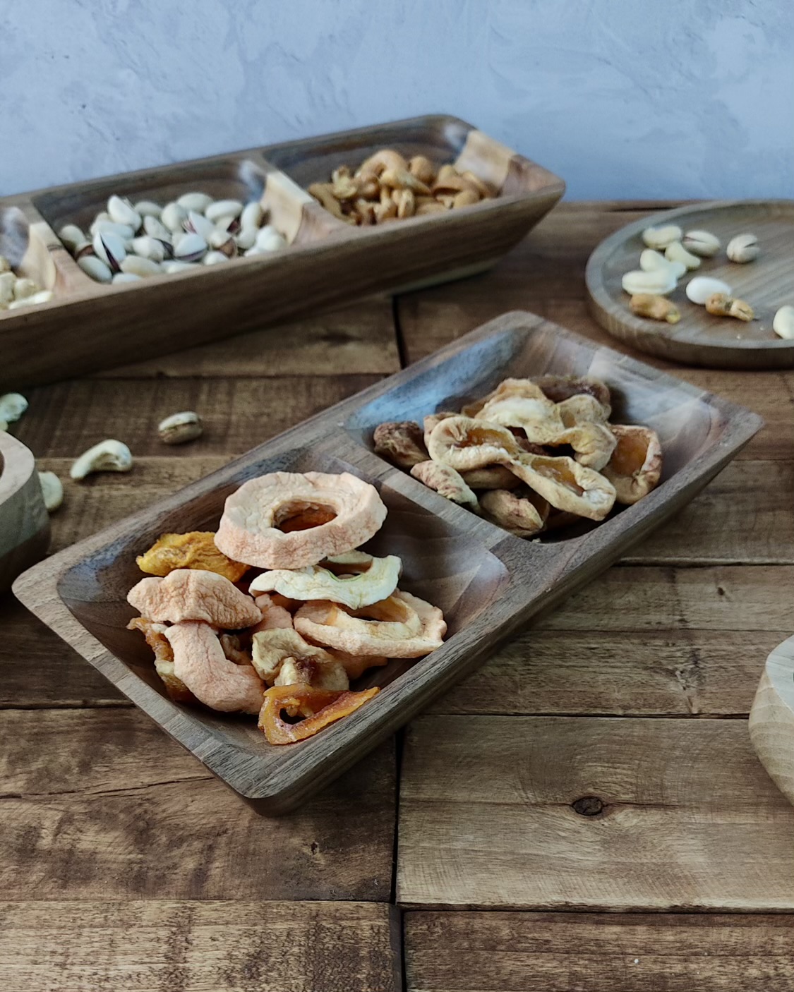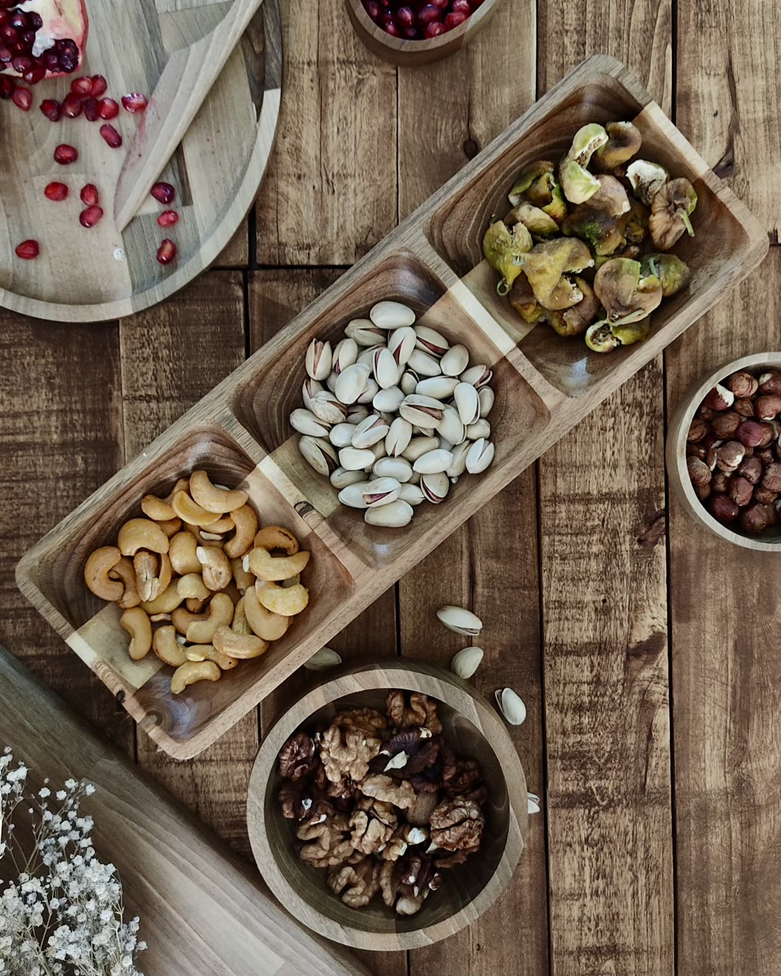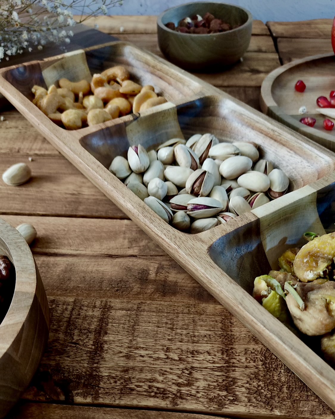 چهار بخش مساوی که امکان سرو چند مدل خوراکی بدون ترکیب شدن طعمها رو فراهم میکنه. از زیتون و پنیر گرفته تا میوه خشک و آجیل؛ همه چیز منظم، شیک و دلنشین.