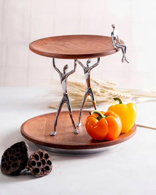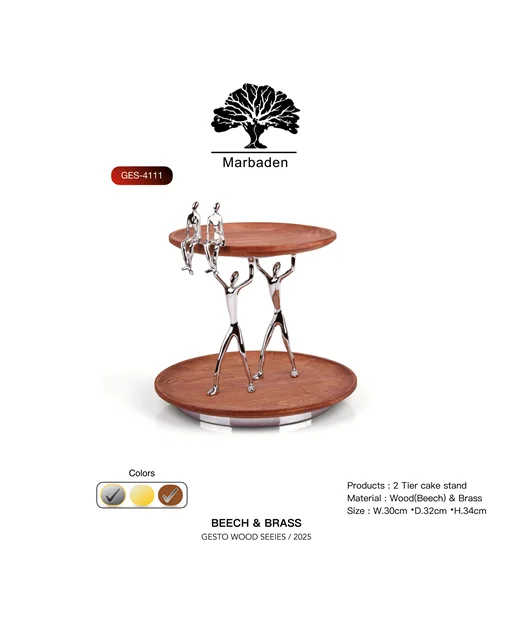 ترکیب اصیل چوب راش فندقی با درخشش آدمکهای برنجی نقرهای، این شیرینیخوری دو طبقه گرد را به یک اثر هنری خاص برای پذیراییهای شیک تبدیل کرده است.