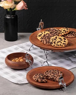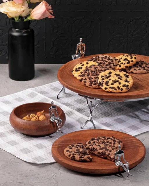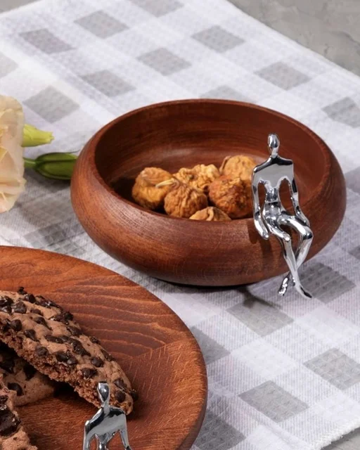 یک ست زیبا و اصیل شامل پیاله و پیشدستی از چوب راش مرغوب با رنگ فندقی طبیعی و ادمکهای برنجی نقرهای براق. ترکیبی از سادگی و شکوه که برای جهیزیهی عروس و پذیراییهای خاص انتخابی شایسته است.