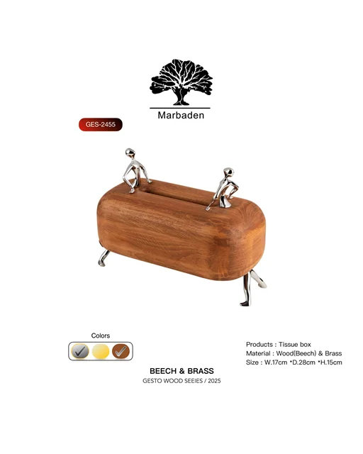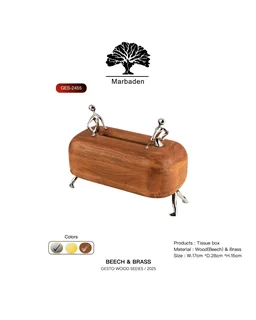 جعبه دستمال ژستو ترکیبی از اصالت چوب طبیعی و جلوهی خاص فلز برنج است. بدنه از چوب راش با کیفیت بالا ساخته شده و سطحی نرم، صیقلی و خوشرنگ دارد. وجود آدمکهای برنجی براق روی بدنه و پایهها، این محصول را به یک اکسسوری لوکس و خاص برای دکوراسیون منزل یا محل کار تبدیل کرده است.