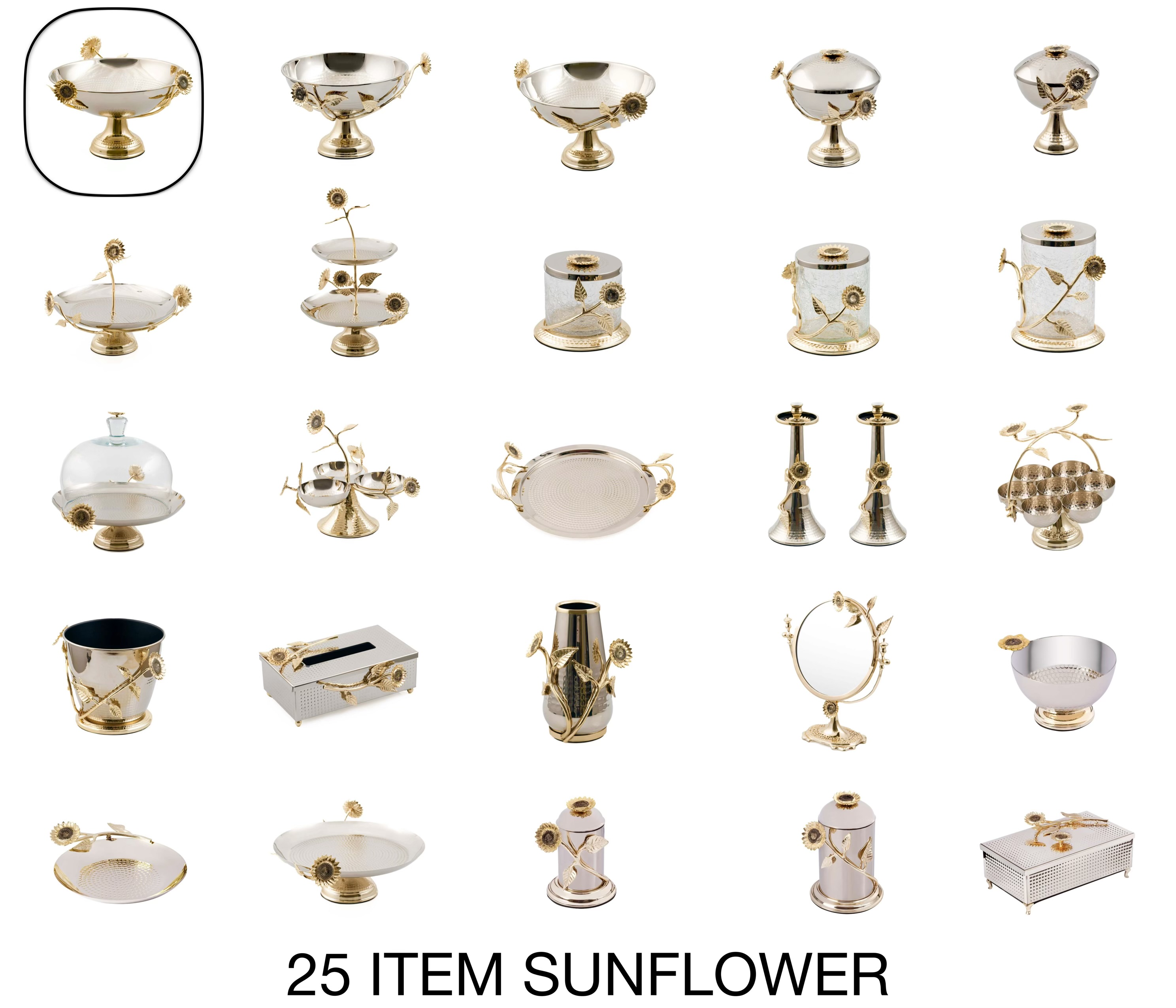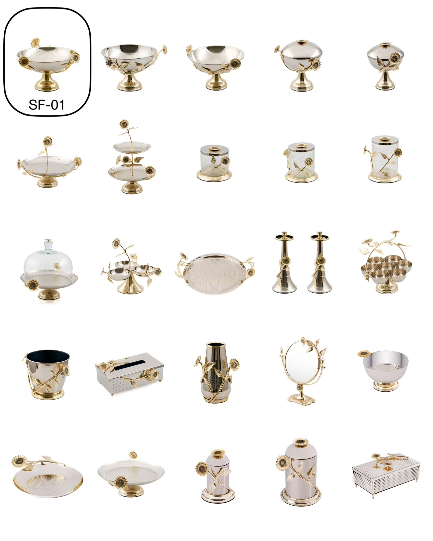 مجموعه Sunflower برنجی با 25 آیتم طرح گل آفتابگردان ، باکیفیتترین و جذابترین پذیرایی در ایران را ارائه میدهد.