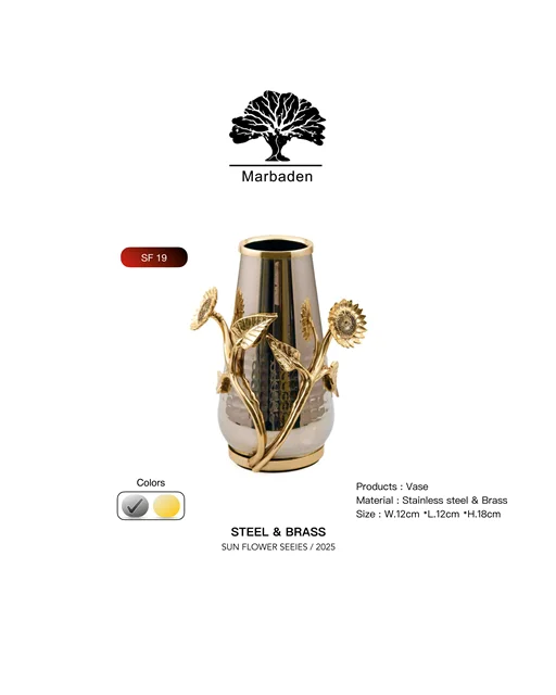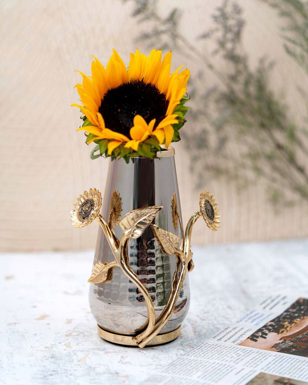 •بدنه براق نقرهای همراه با گل آفتابگردان برنجی که جلوهای خاص به دکور میدهد