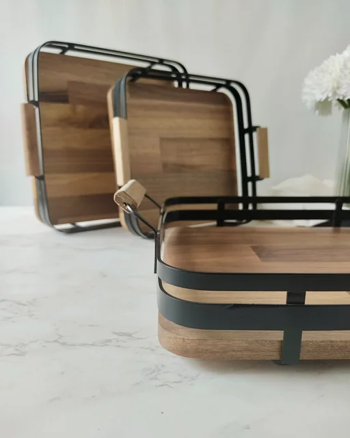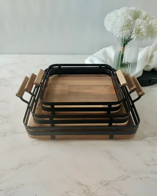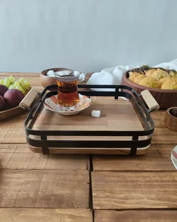 وقتی پذیرایی برات فقط چیدن خوراکی نیست و دنبال یه حس خاص و متفاوتی، این سینی مربع چوب گردو با فریم فلزی صاف دقیقاً همون چیزیه که دنبالش بودی. ترکیب گرمای چوب گردوی طبیعی با سردی و وقار فلز، یک تعادل چشمنواز و شیک رو به میزت میاره.