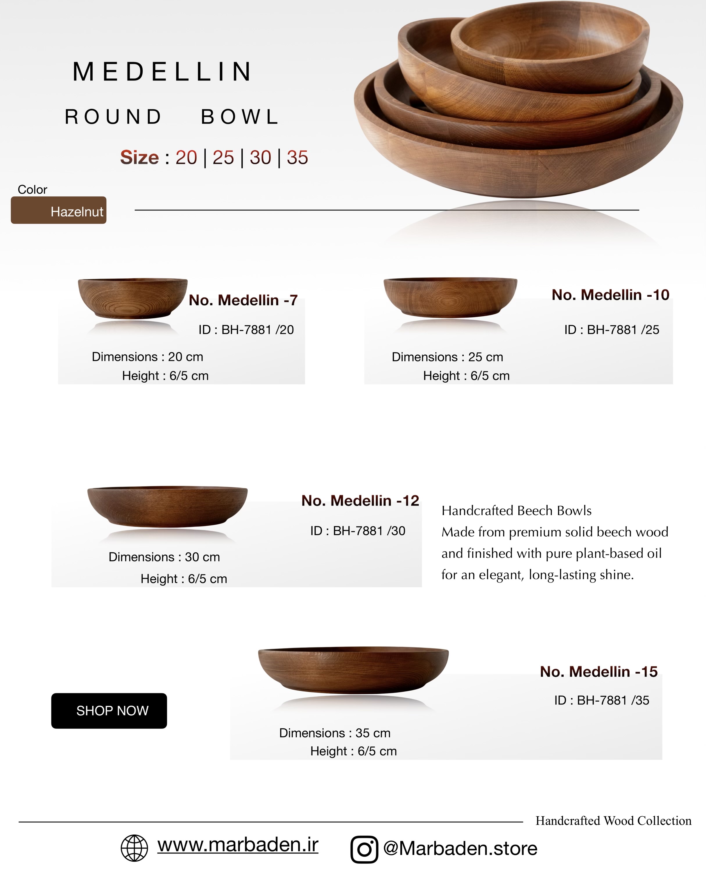 کاسه ها گرد لبه باز قطر های 20 | 25 | 30 | 35 (چوب راش فندقی) Medellin