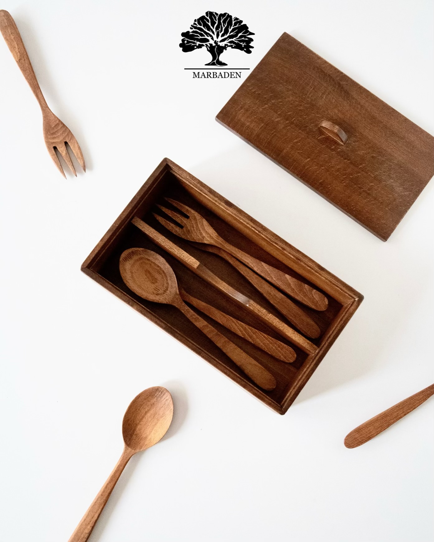 این جاقاشق و چنگال با رنگ فندقی به زیبایی با دیگر لوازم چوب راش شما (مانند سطل زباله، جادستمال کاغذی، ظروف پذیرایی و …) ست میشود و فضایی یکدست، گرم و منظم در خانه ایجاد میکند.