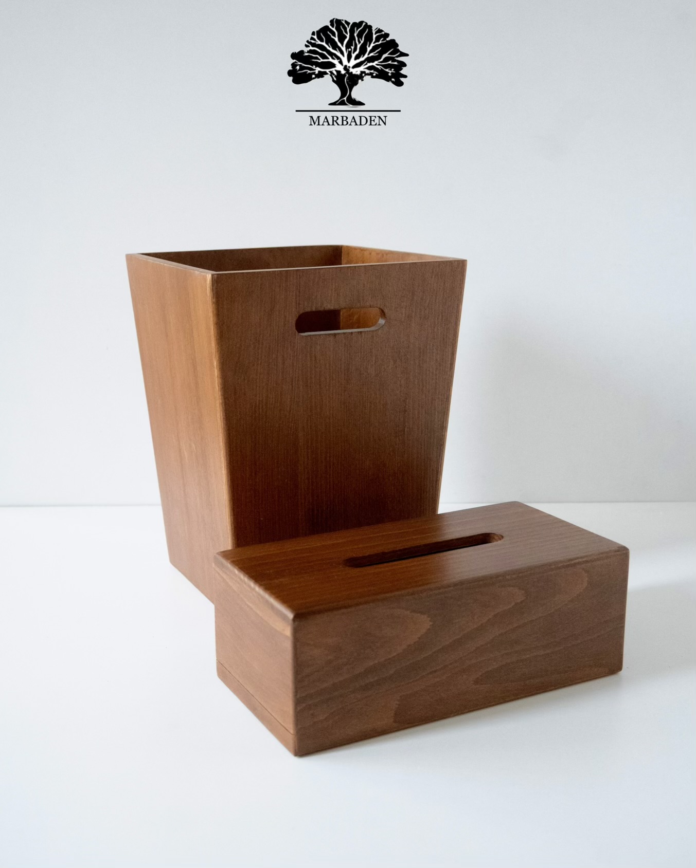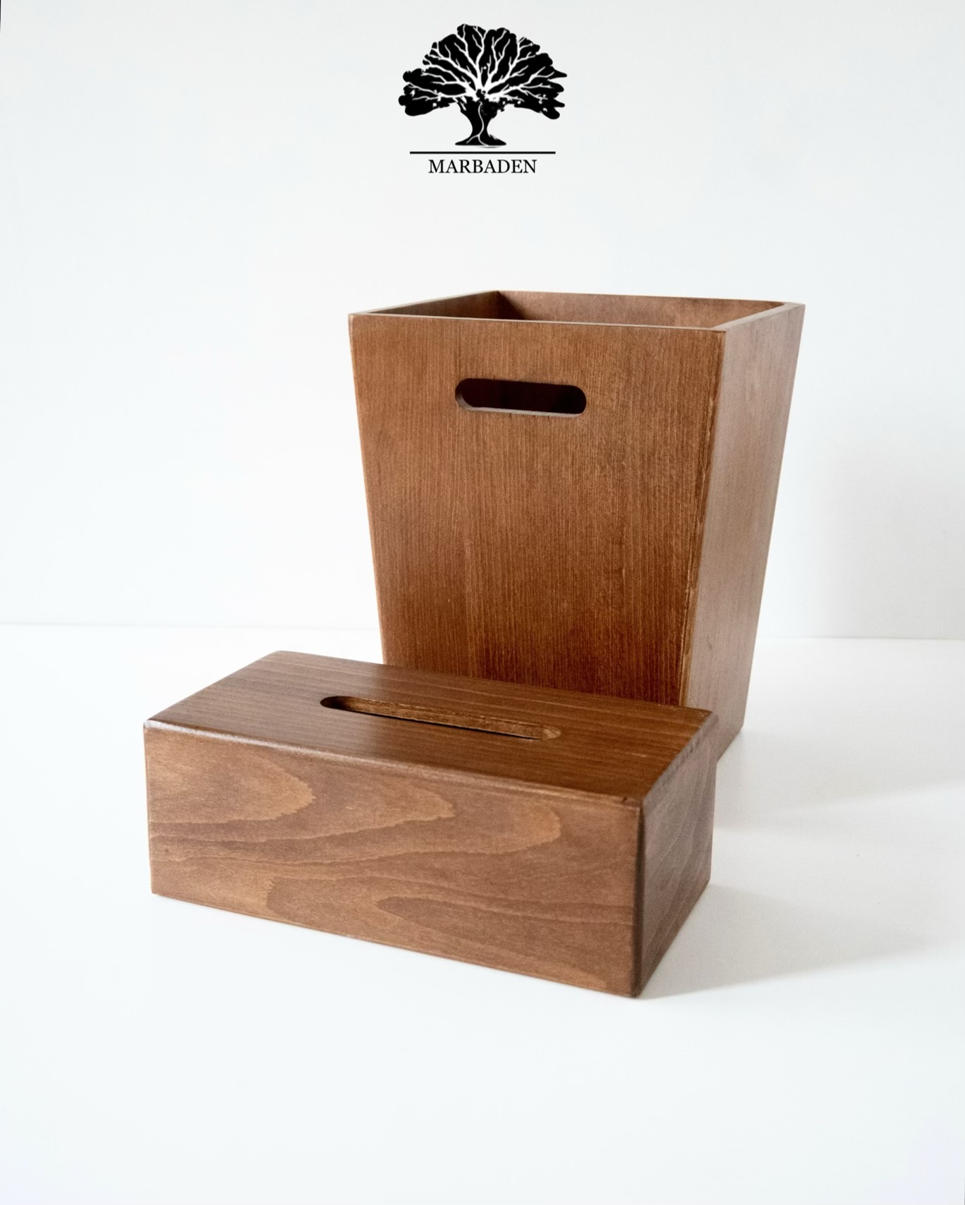 🪵 ست سطل زباله و جعبه دستمال چوب راش رنگ فندقی با پوشش اسمو آلمان