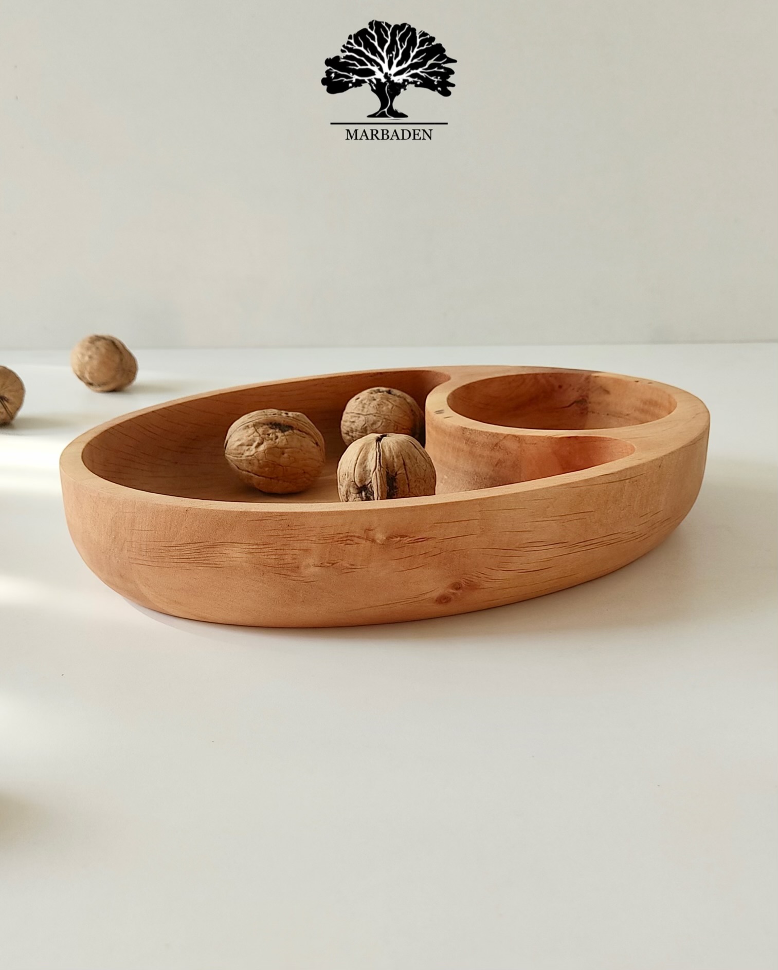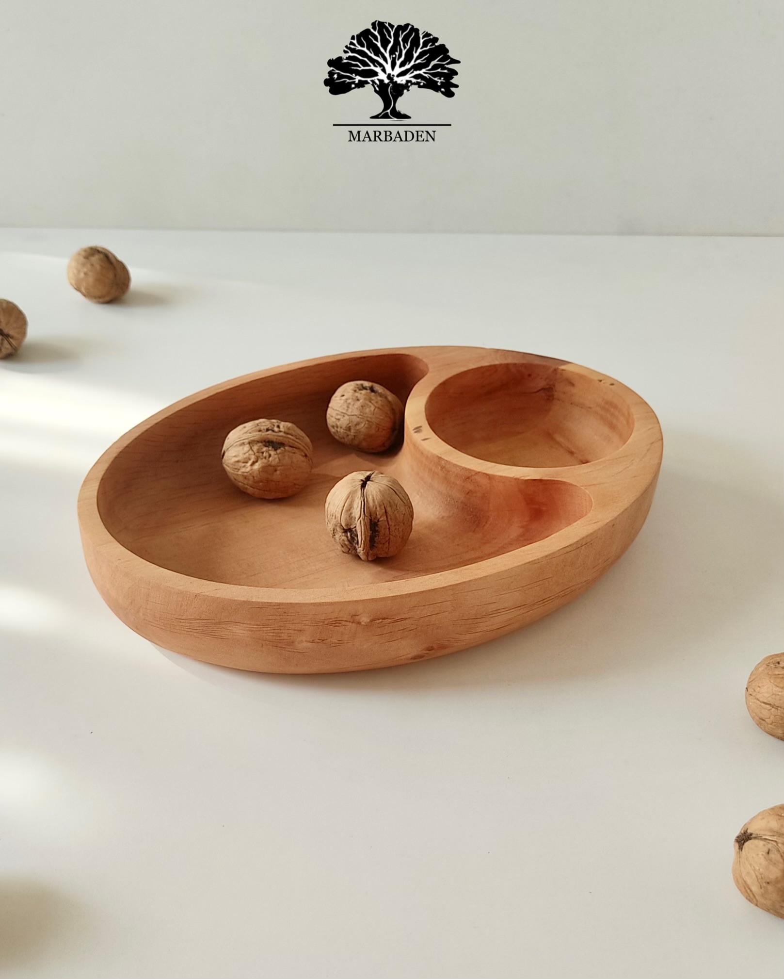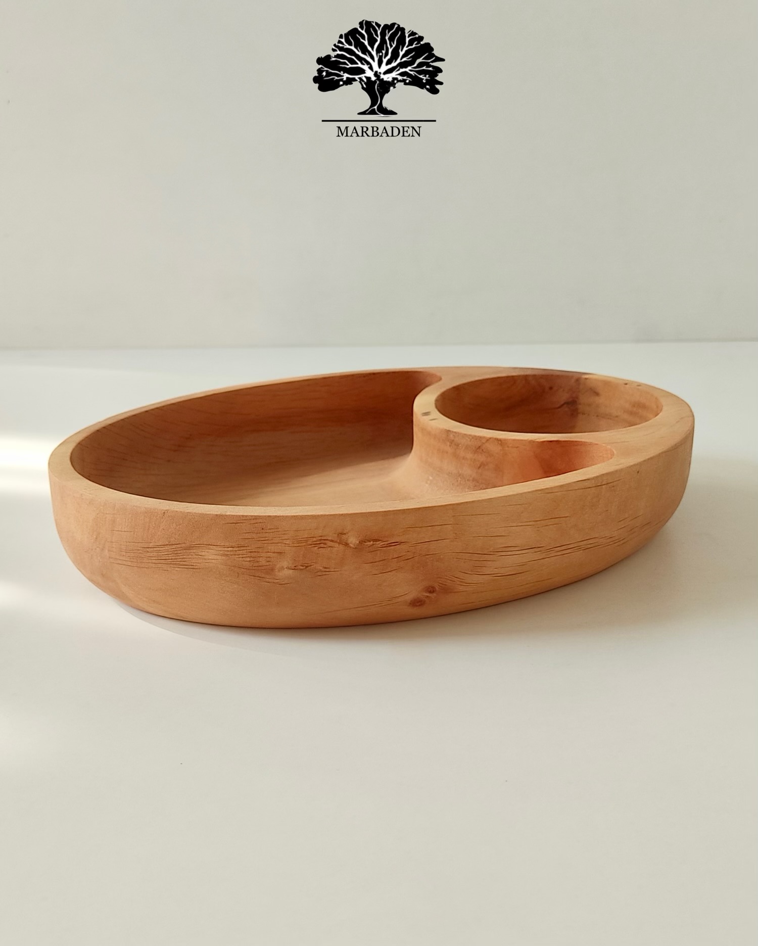 این مدل با فرم بیضی و دو بخش کاربردی طراحی شده است؛ یک قسمت با فرم گرد و قسمت دیگر به شکل کشیدهتر، تا تنوع بیشتری برای سرو مواد مختلف داشته باشید. تمام کار با ظرافت و بهصورت دستساز تولید شده است. لبهها و فضای داخلی با انحناهای ملایم طراحی شدهاند تا ظاهر محصول طبیعی، چشمنواز و کاملاً هماهنگ باشد.