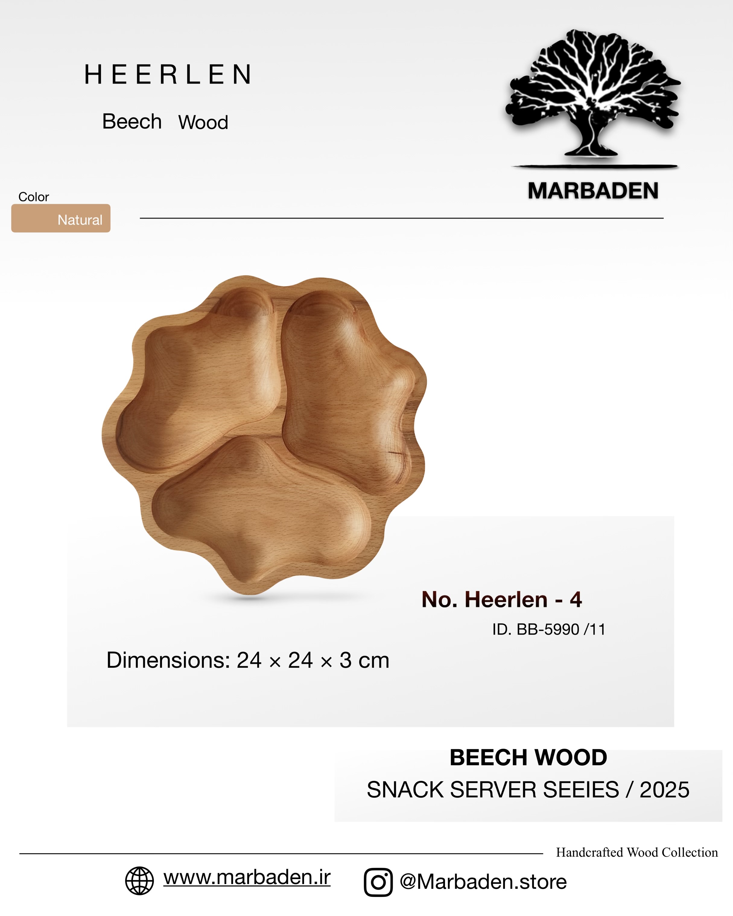 ساختهشده از چوب راش درجهیک، با قطر تقریبی ۲۴ سانتیمتر و ارتفاع ۳ سانتیمتر. طراحی خاص و منحصربهفردش باعث میشود یک انتخاب زیبا، کاربردی و متفاوت برای سرو روی میز باشد.