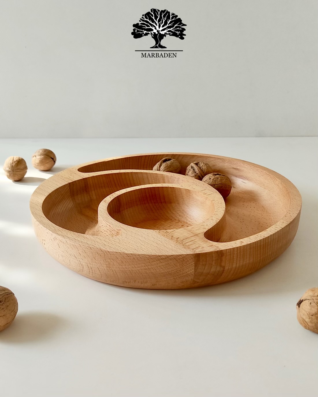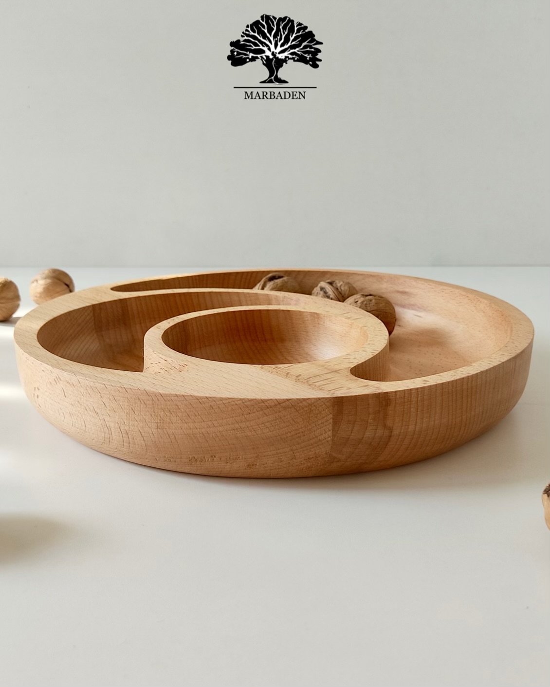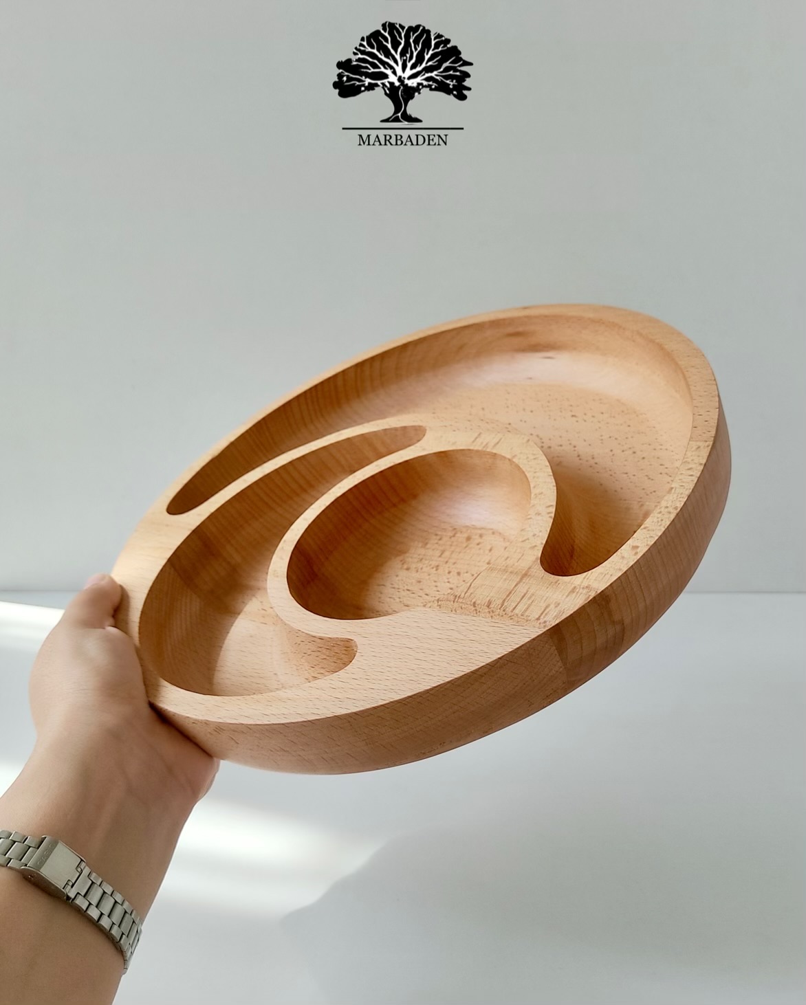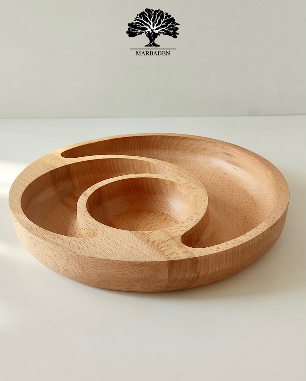 این مدل بهصورت کاملاً دایرهای طراحی شده و سه بخش مجزا درون آن قرار گرفتهاند؛ یک بخش مرکزی عمیقتر و دو بخش گرد و متفاوت در کنارهها. تمام تراشها با ظرافت و بهصورت دستساز اجرا شدهاند. لبهها و فضای داخلی با انحنای ملایم طراحی شده تا محصول ظاهر طبیعی و هماهنگتری داشته باشد.
