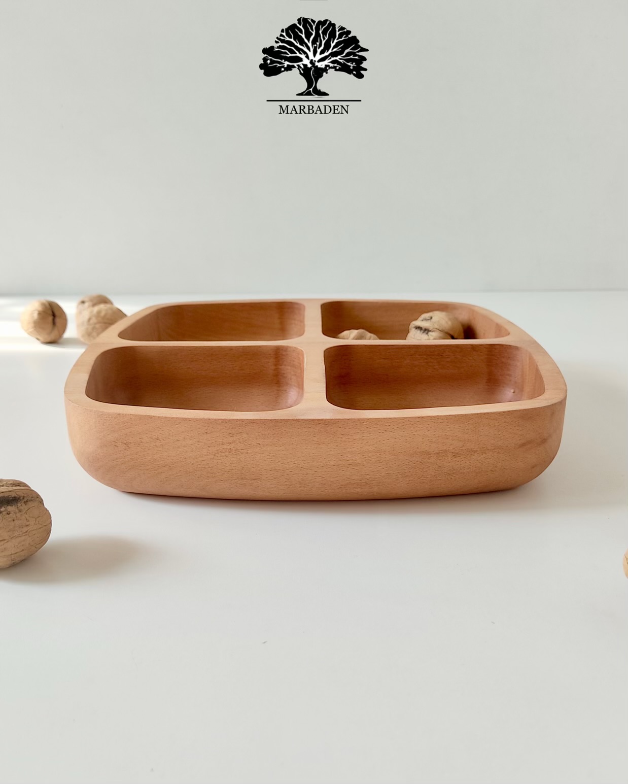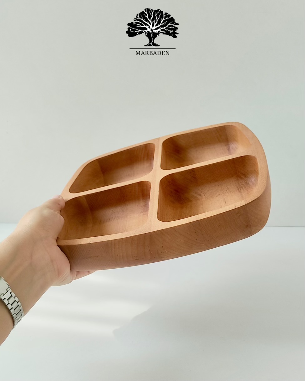 این مدل دارای چهار بخش مساوی است که بهصورت منظم و دقیق در کنار هم قرار گرفتهاند. فرم مربعی ظرف همراه با لبههای منحنی و تراشکاری دقیق، جلوهای بسیار تمیز، چشمنواز و کاملاً دستساز به آن داده است.