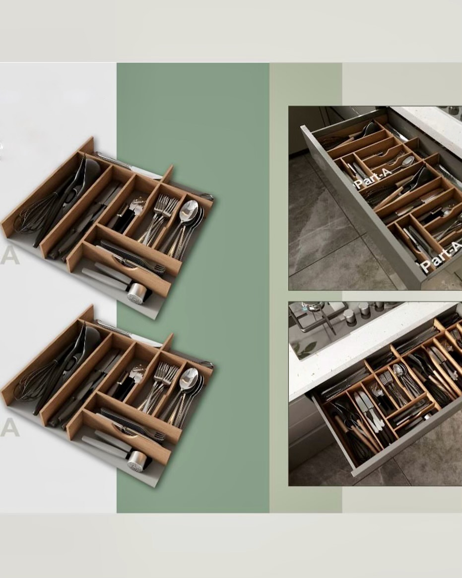 طراحی مدولار و تقسیمبندیهای گوناگون برای انواع قاشق، چنگال، چاقو و ابزارهای بزرگتر.
