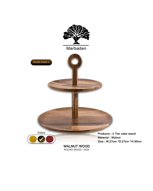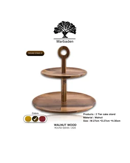 از چوب طبیعی گردو، طراحیشده با دو صفحه تخت به قطر ۲۷ و ۱۹ سانتیمتر و ارتفاع کلی ۳۰ سانتیمتر. ستون مرکزی مقاوم و محکم برای تحمل وزن انواع خوراکیها.