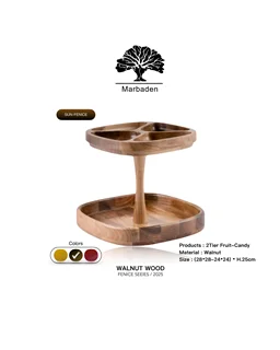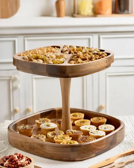 (مربع با گوشههای گرد)، طراحیشده با یک طبقه سهخانه برای تنقلات و یک طبقه بزرگتر برای میوه و میوه خشک. ترکیبی از زیبایی، اصالت و کارایی برای هر پذیرایی.