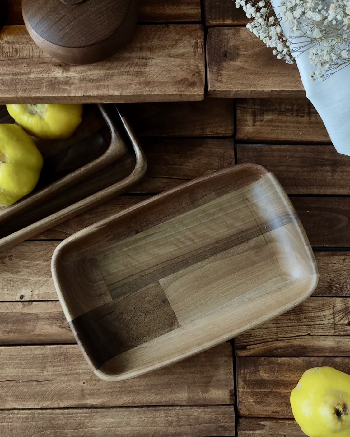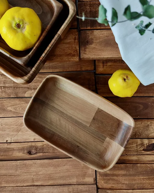 ظرفی دستساز از چوب طبیعی گردو با طراحی مدرن و لبههای نرم، مناسب برای سرو غذاهای خانگی با جلوهای خاص و گرم از طبیعت.