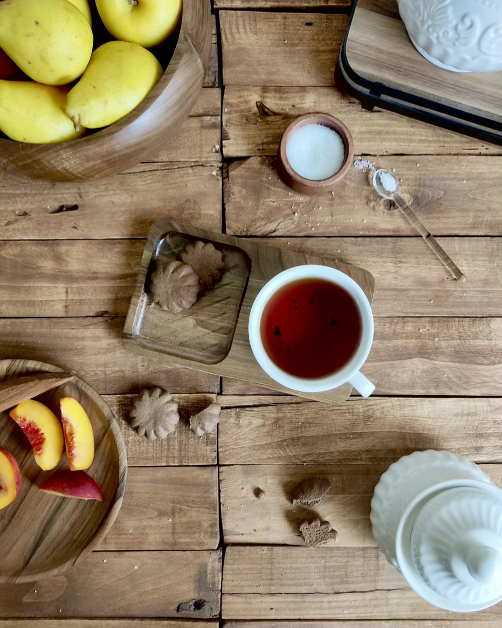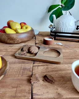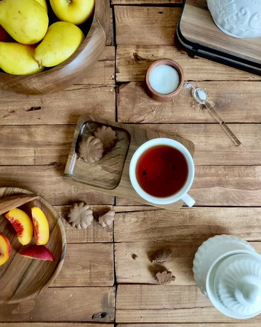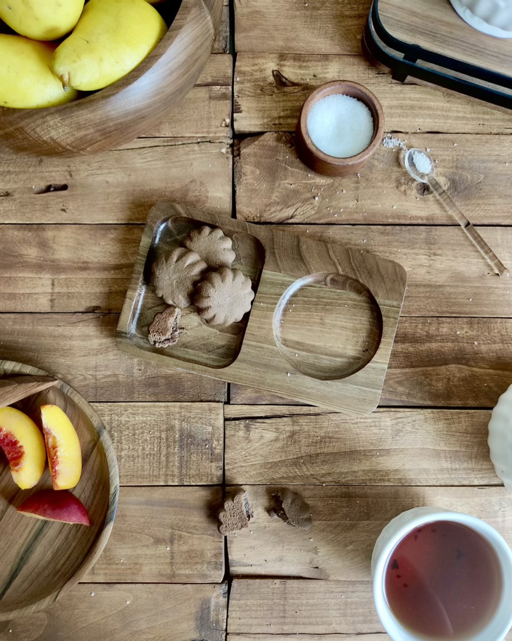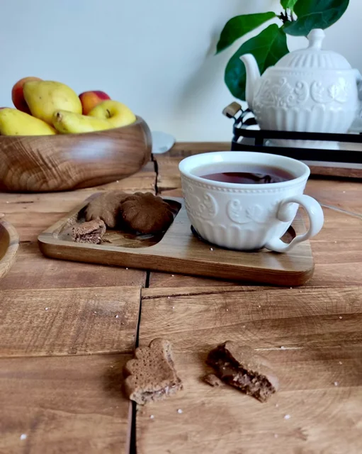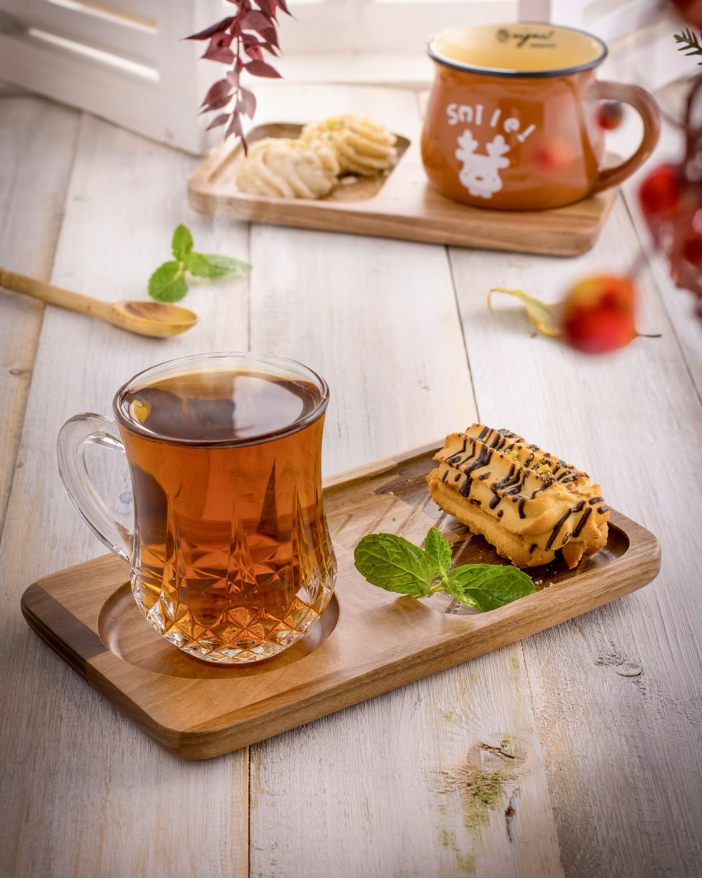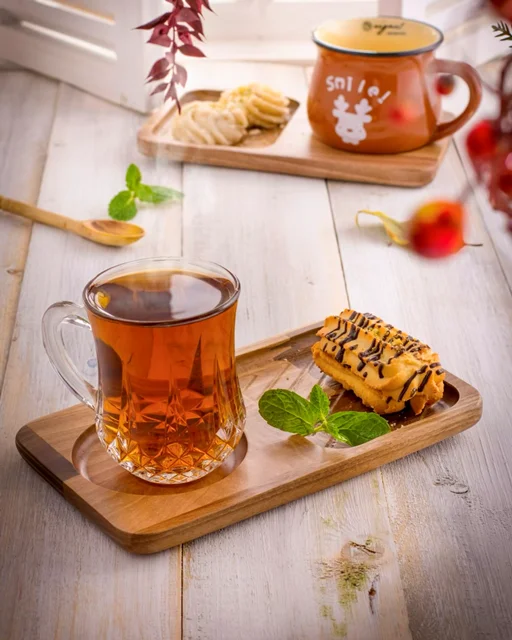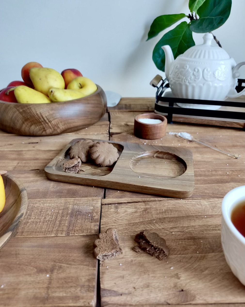 ترکیبی از چوب طبیعی گردو با بافت گرم و اصیل، مناسب برای سرو دسر، چای یا خوراکیهای کوچک در مهمانیهای دونفره یا تکنفره.