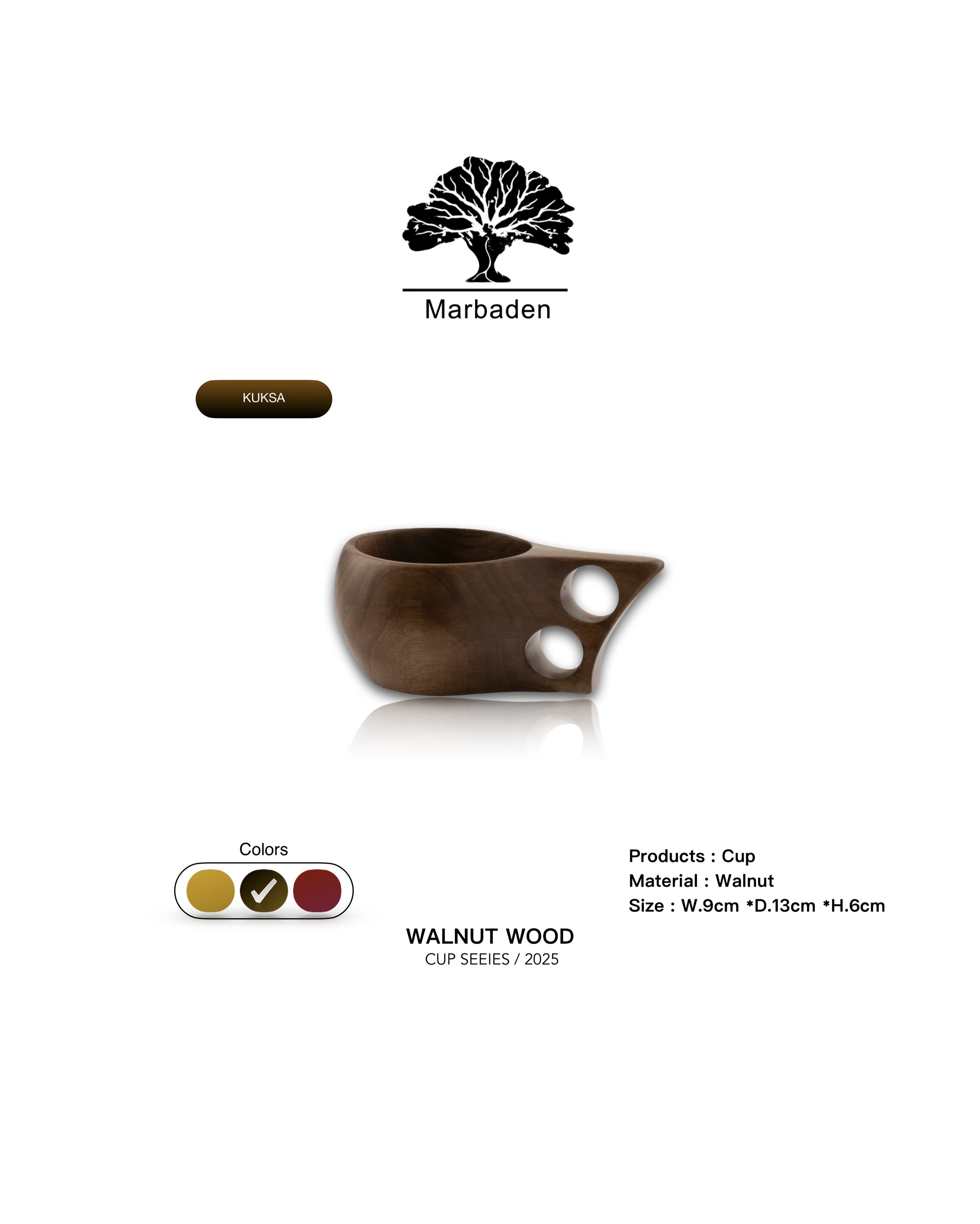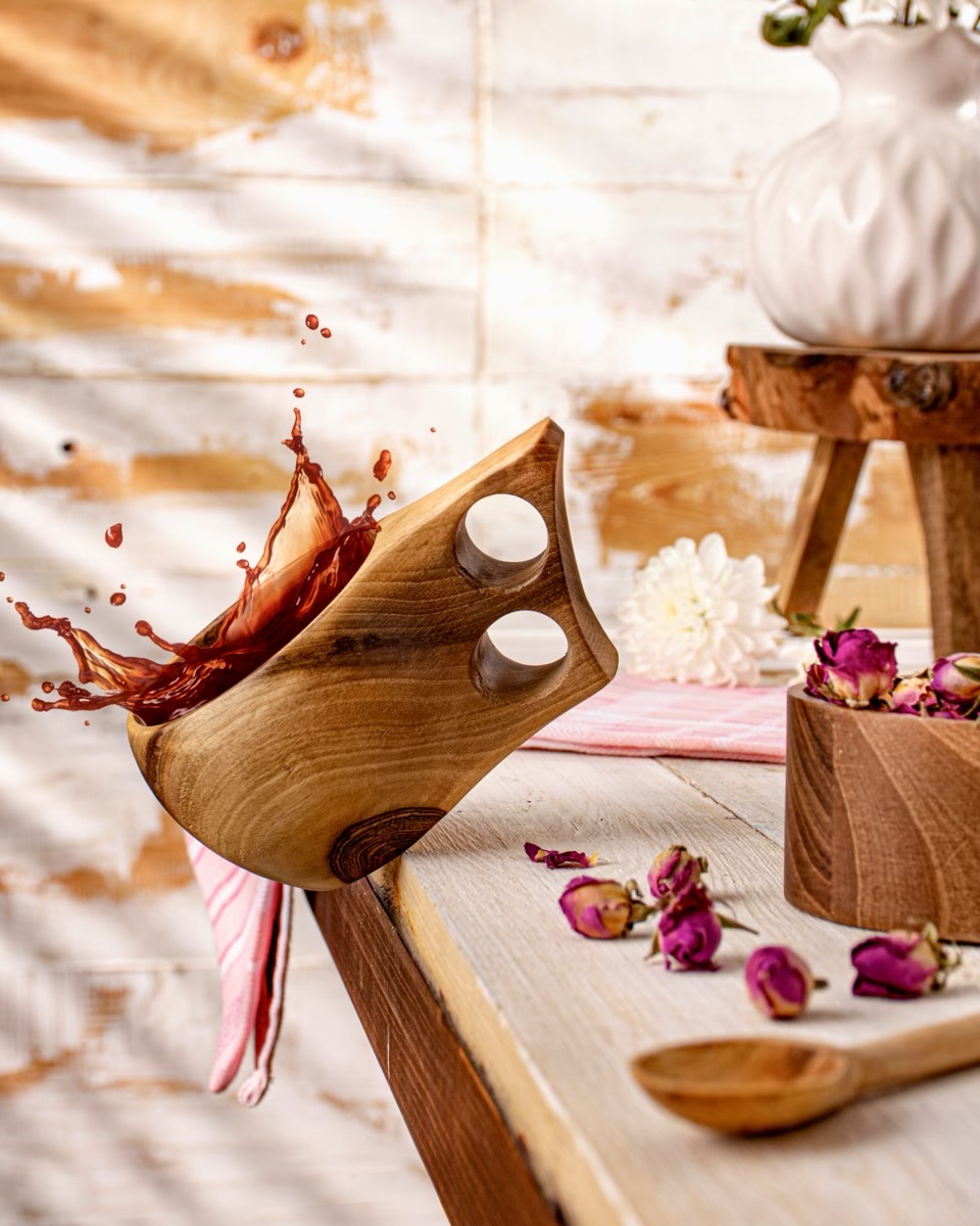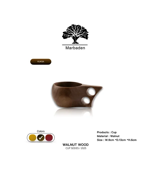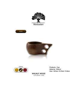 فنجان دستساز از چوب طبیعی گردو، با طراحی ارگونومیک و الهامگرفته از سبک نوردیک.