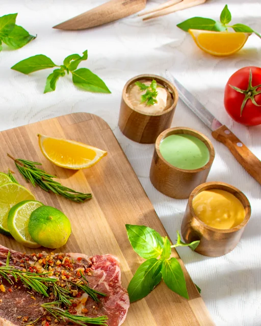 (زیتونخوری بیضی، تخته صبحانه کوچک و کاسه سس گرد)