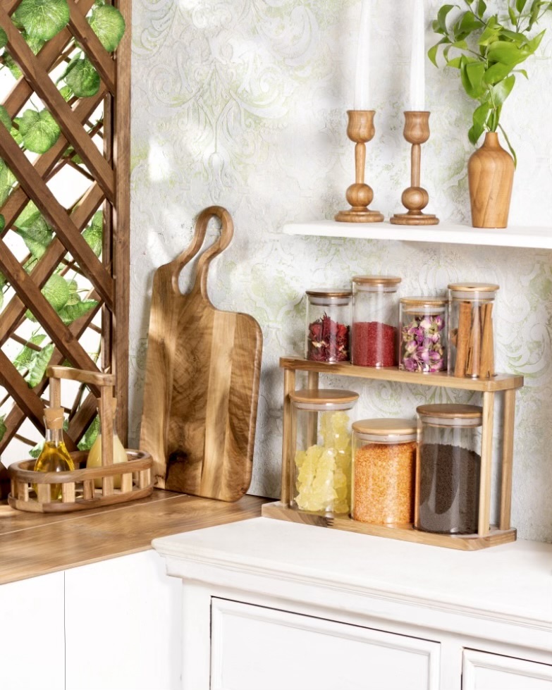 استند تک دو طبقه ادویه از چوب طبیعی گردو، استند تک طراحیشده برای ایجاد نظم و زیبایی در آشپزخانه.