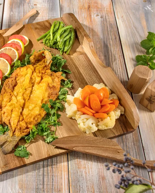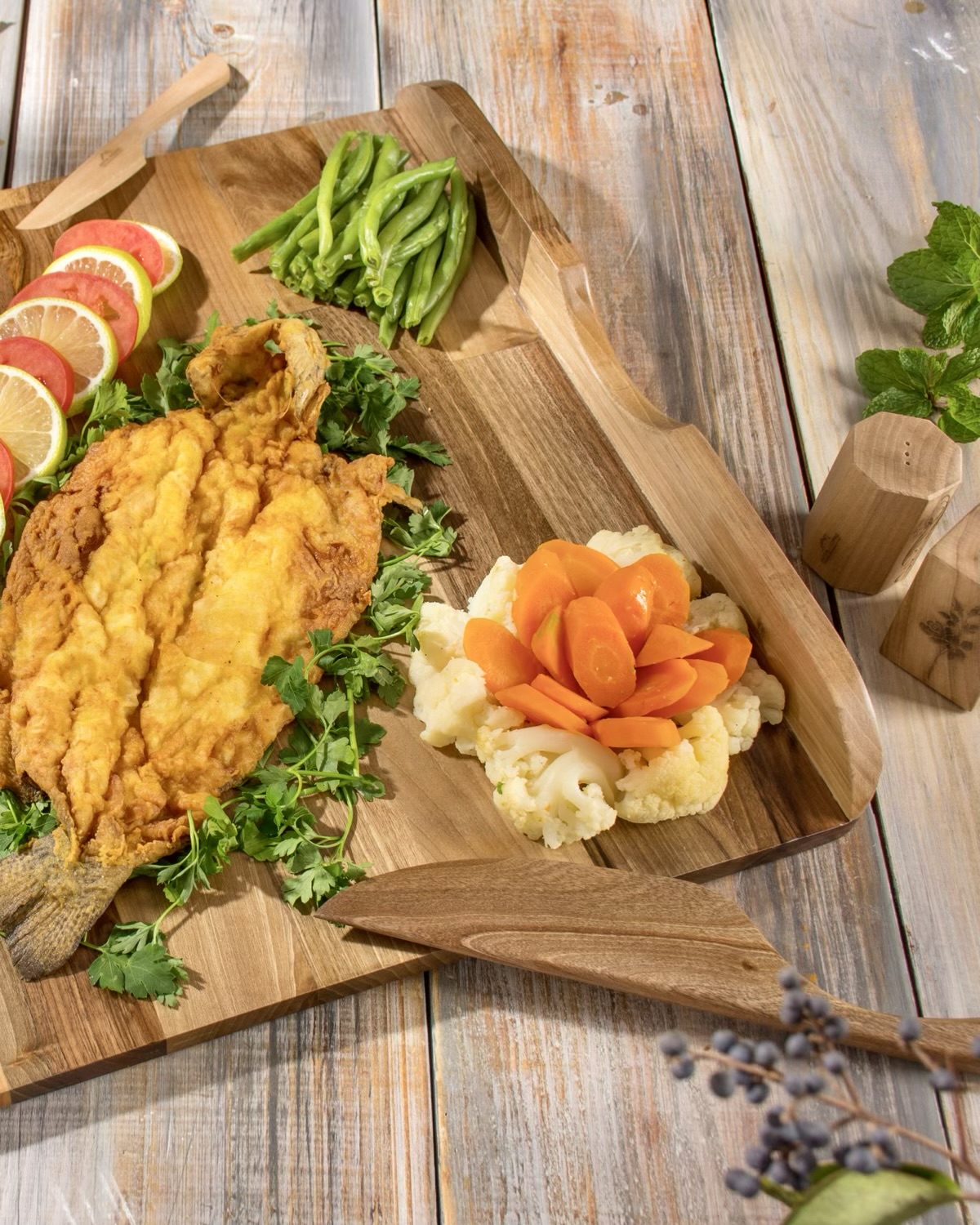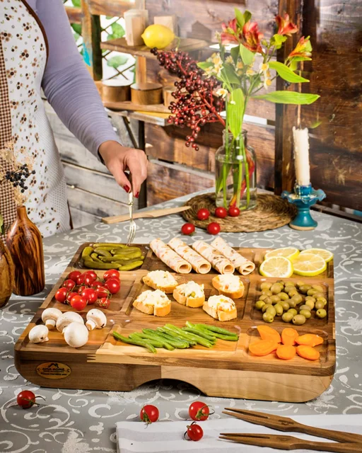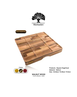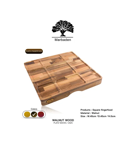 چوب گردوی طبیعی، با ابعاد ۴۵ سانتیمتر و ضخامت ۵ سانتیمتر. طراحی دوطرفه: یک سمت دارای ۹ بخش مجزا برای سرو تنقلات و مزهها، و سمت دیگر سطحی صاف برای استفاده بهعنوان تخته سرو ساده. انتخابی خاص و کاربردی برای میز پذیرایی.